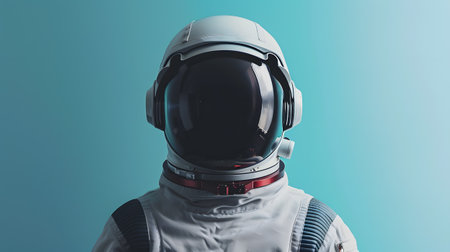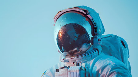 Closeup of an astronaut in outerwear helmet on electric blue background