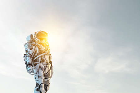 Astronaut leaving earth. Searching for a new home for humanity. Concept about science and nature. Lost into deep space