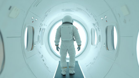 Astronaut wearing spacesuit exploring a futuristic spaceship, walking in a white corridor toward a bright circular window or portal, in a science fiction scene