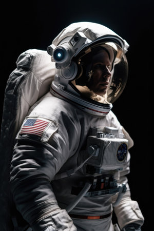 Detailed close-up of a youthful man astronaut wearing a spacesuit and space helmet