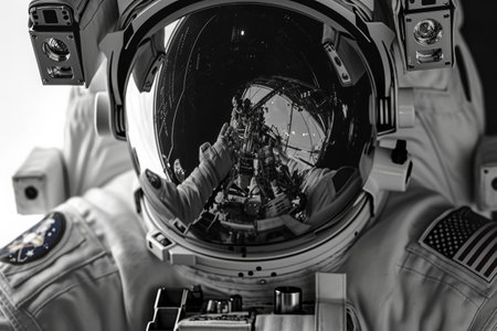 Detailed view of a male astronaut's helmet visor against a white background, focusing on space exploration gear