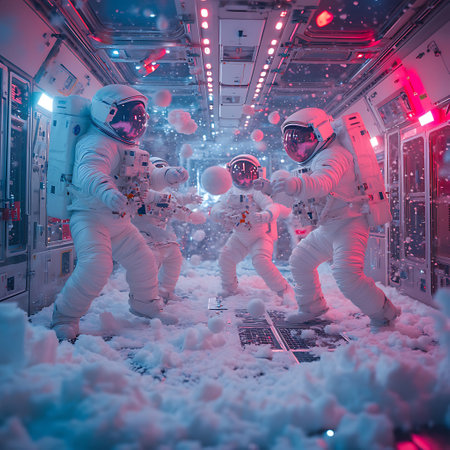 A whimsical scene featuring astronauts engaging in playful snowball fights inside a colorful spacecraft filled with vibrant lights, creating a magical atmosphere.