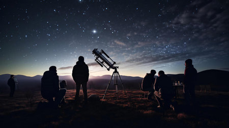 Group of people stargazing in a field using telescopes under a starry night sky