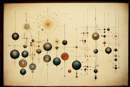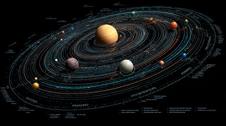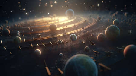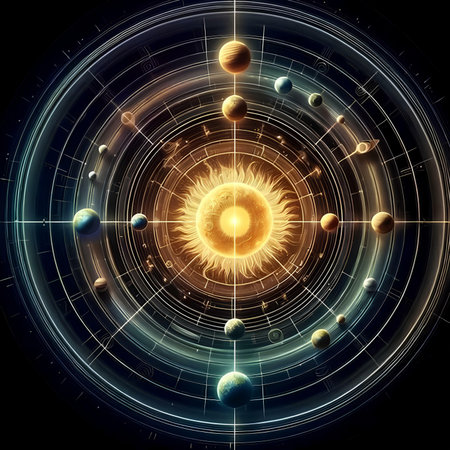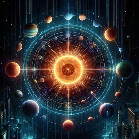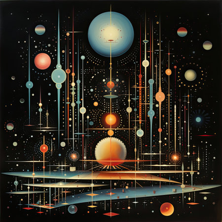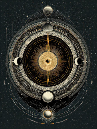 Explore the mesmerizing beauty of cosmic patterns and celestial orbits in this stunning artwork. Intricate designs and ethereal elements create a harmonious visual journey through space.