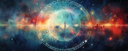 Illustration of zodiac wheel with astrological signs against starry sky in night