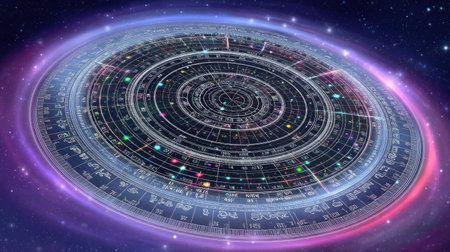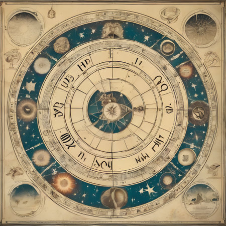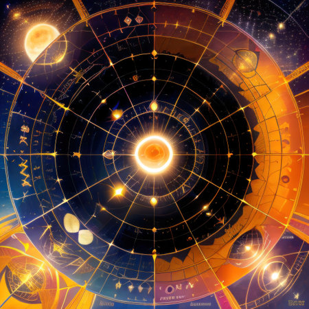 This captivating image features an intricate astrological wheel adorned with golden zodiac signs and celestial symbols set against a dark background.