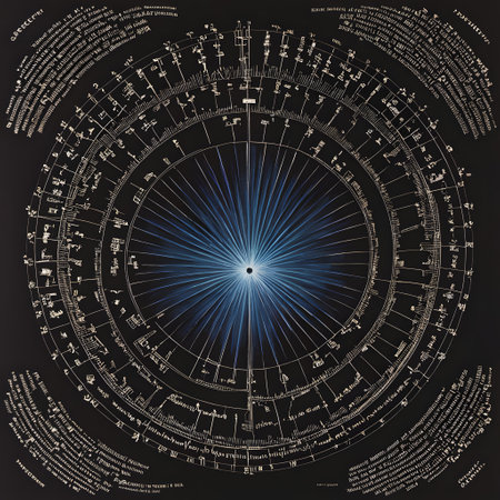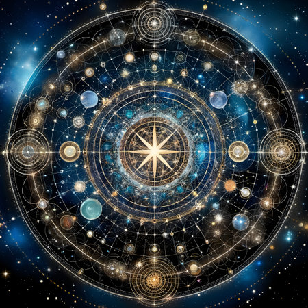 This image portrays a complex, ornate astral diagram with a central compass rose design, surrounded by an intricate array of geometric patterns, circles, and interconnected lines. These elements collectively seem to map out a symbolic representation of the cosmos, with various celestial bodies like planets and stars illustrated within the diagram. The background is a deep blue starry space, enhancing the cosmic theme.