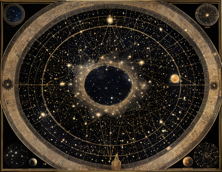 This image showcases an intricate celestial map, with a vast array of stars connected by golden lines, creating a mesmerizing and detailed constellation network. At the center, a dark void contrasts sharply with the surrounding luminous stars. The outer edges are adorned with elaborate, gold-etched borders, incorporating additional astronomical symbols and planetary diagrams, highlighting the profound beauty and complexity of the universe.