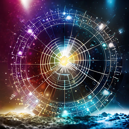 This image features a visually striking, abstract representation of a cosmic mandala, radiating vibrant colors against a star-studded background. The mandala is constructed from intricate geometric patterns and concentric circles, glowing with a luminous central core. The surrounding space is filled with twinkling stars, adding a sense of depth and mystery to the composition. The combination of vivid blues, purples, yellows, and greens enhances the ethereal and otherworldly atmosphere of the scene.