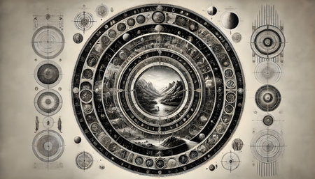 The image is a detailed, circular, vintage-style illustration featuring multiple concentric rings. Each ring is filled with intricate symbols, astronomical objects, and geometric patterns. The center depicts a serene landscape with mountains and a river, symbolizing a harmonious blend of natural and cosmic elements. Surrounding the main circle are various diagrams and celestial charts, adding to the complexity and richness of the artwork.