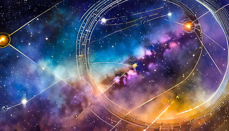 Explore the beauty of the cosmos with this intricate circular cosmic map, featuring colorful stars and galaxies against a mesmerizing deep space backdrop.