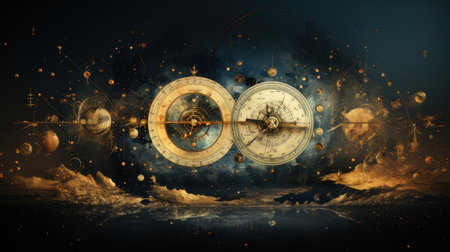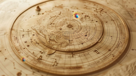 Generative AI : Ancient calendar with constellations and astronomical instruments against the background of stars Symbol of science astronomy astrology mystery education mysticism