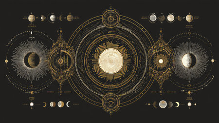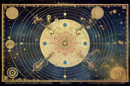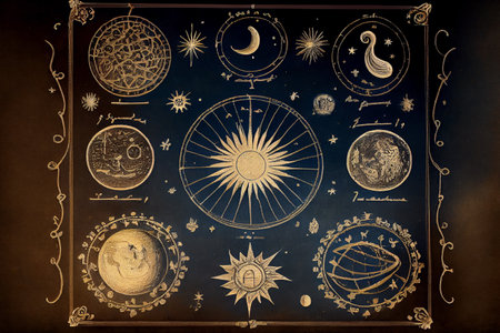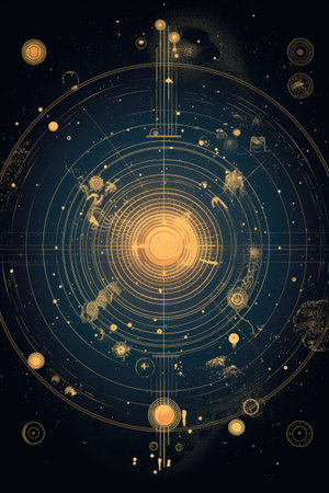 The image features an intricate and ornate astrological chart, which is displayed in black and gold colors. The chart is filled with various symbols, including circles, stars, and other geometric shapes. There are at least nine distinct circles scattered throughout the chart, each varying in size and position. Additionally, there are three stars visible within the chart, adding to its complexity and visual appeal. Overall, this astrological chart showcases a rich tapestry of symbols and patterns that represent the interconnectedness of celestial bodies and their influence on human life.