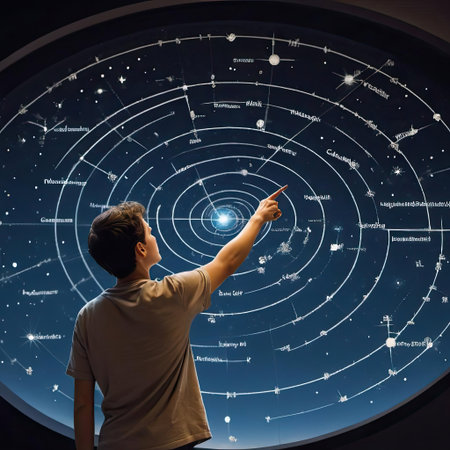 A person stands in front of a large, immersive digital display showcasing a detailed star map. They are pointing at different celestial bodies, engaged in uncovering the mysteries of the universe.