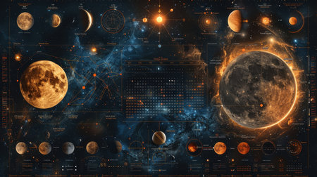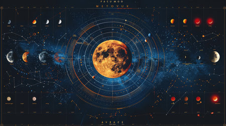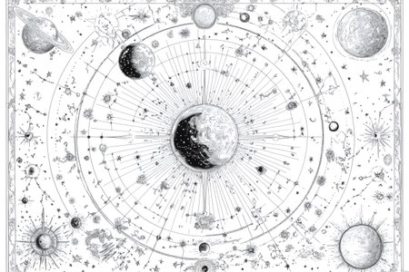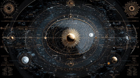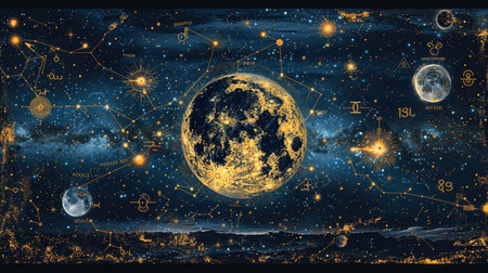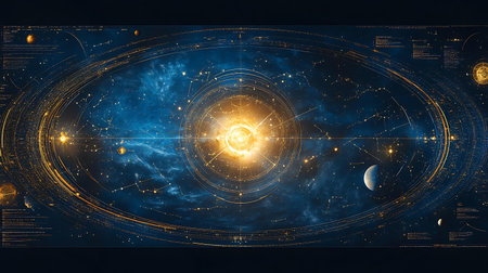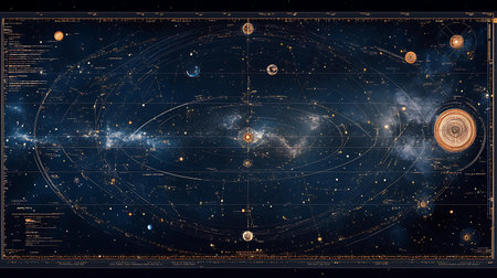 A stunning celestial map featuring intricate astronomical elements in vibrant blue and gold hues. Ideal for educational projects, artistic creations, or space-themed designs.