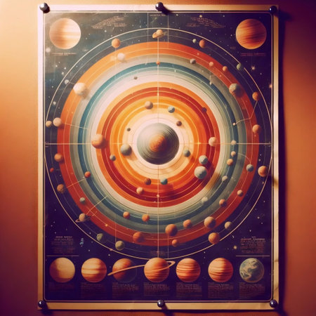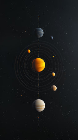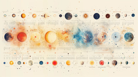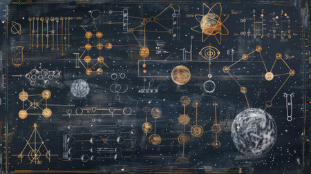 Illustrations show celestial bodies and planetary systems, presenting artistic astronomy and science concepts creatively arranged on a dark background.