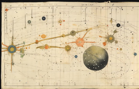 Intricate depiction of ancient astronomical instruments on vintage paper, surrounded by celestial elements and old maps. Evokes a sense of historical exploration and scientific discovery.