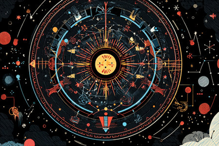 This vibrant and detailed zodiac wheel showcases various astrology symbols surrounding a radiant sun, all set against a dark space background, perfect for astrology enthusiasts.