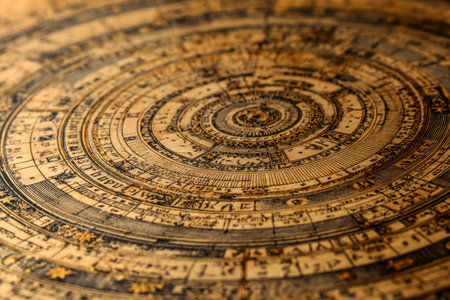A historic, elaborately carved chart featuring concentric circles and enigmatic symbols, evoking mystery and craftsmanship in cosmic timekeeping.