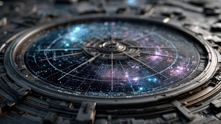 An elaborate cosmic map displays a vibrant galaxy filled with stars and nebulae. The intricate machinery surrounding the map enhances the futuristic atmosphere of the scene.