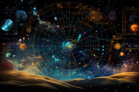 High-tech panoramic Earth sky map with real constellations, planetary nodes, and astrological rings Futuristic Education and Scientific Visualizations Space-Themed UI/UX Backgrounds for VR and Tech Brands