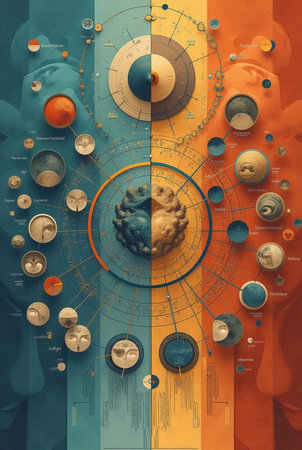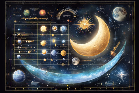 An intricate display of celestial bodies and ancient tools showcasing the wonders of the universe.
