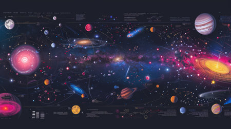 This vibrant infographic presents a detailed visualization of the structure of the universe, showcasing stars, planets, and galaxies through intricate designs and colors.
