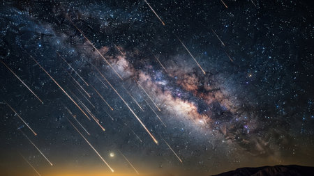 This captivating image showcases a breathtaking night sky filled with numerous shooting stars streaking across the heavens. The Milky Way galaxy is prominently displayed, creating a mesmerizing backdrop of swirling stars and cosmic dust. The horizon is faintly visible, adding depth to the celestial scene.