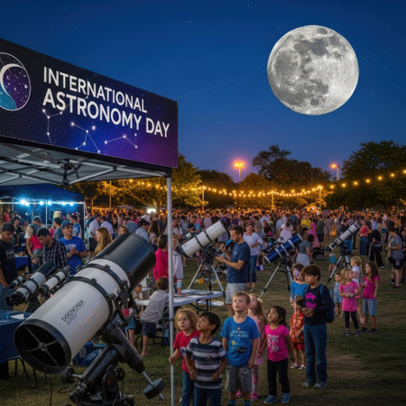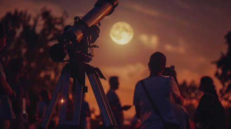 The night sky is a hazy backdrop for the outdoor astronomy event with telescopes and stargazers blending into the scene