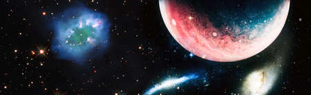 Space scene, background, web banner. Colorful fractal nebula with planet. 3D rendering