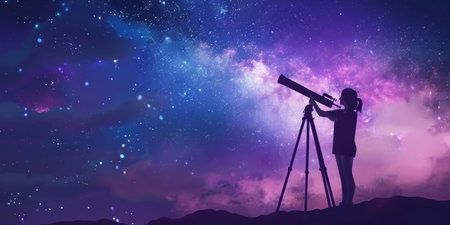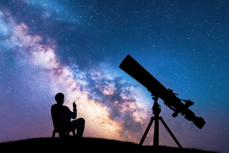 A silhouette of a person looking through a telescope at the vibrant Milky Way galaxy in a starry night sky. The image captures a sense of wonder, exploration, and the hobby of amateur astronomy.