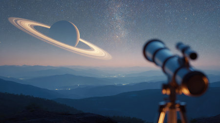 A telescope is mounted on a tripod near a body of water, gazing at the starry sky. It symbolizes the blend of nature, science, and recreation