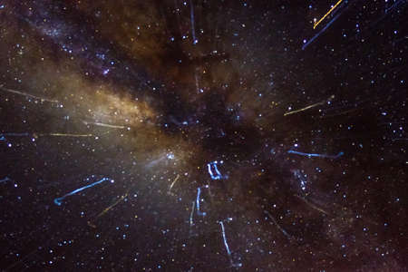 The Milky Way astrophotography: horizontal panoramic view of the galaxy and dark blue night sky, shot with star tracker