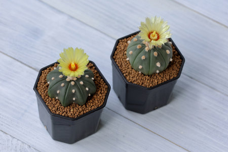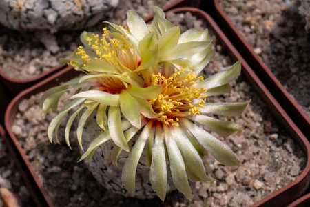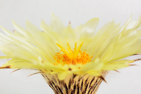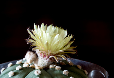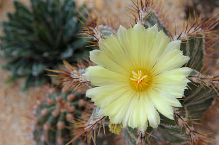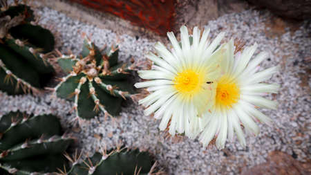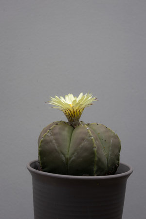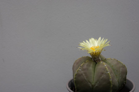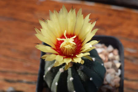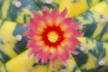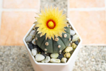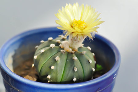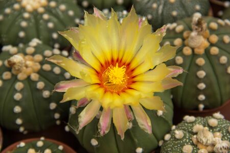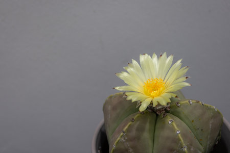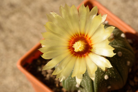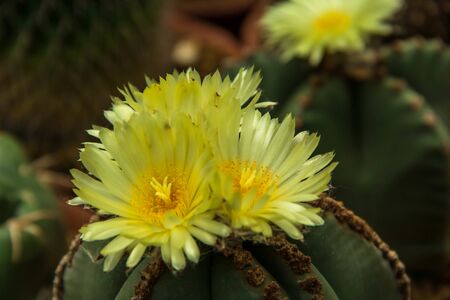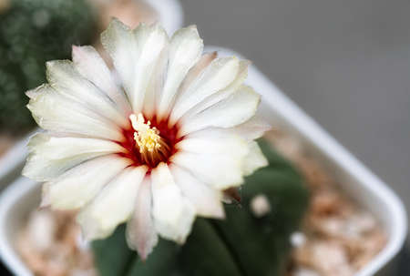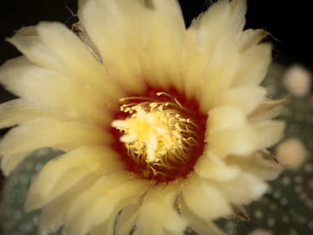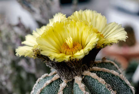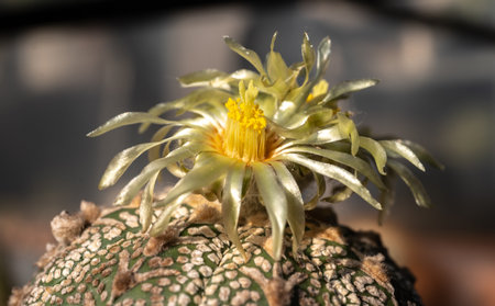 Flowering cactus from Astrophytum family, close-up shot, local focus