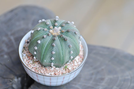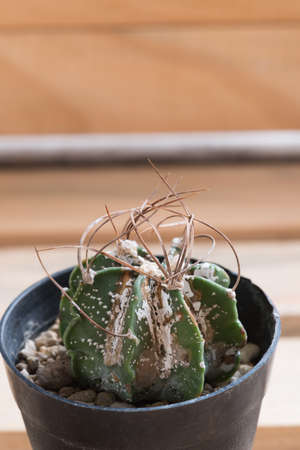 Mini cactus in the small pot on the wooden floor. (Top view) It is a succulent plant with a thick, fleshy stem that typically bears spines, lacks leaves.