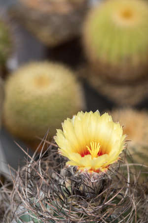Detail of yellow cactus flower, echinocactus, succulent plant