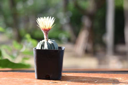 Cactus and yellow flower in a pot with nature bokeh background. Echinofossulocactus Phyllacanthus Lawr. in Loudon.