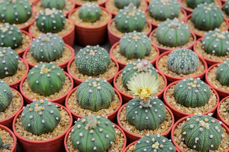 Astrophytum Asterias is a species of thornless cactus and has many beautiful flowers in a garden on an afternoon holiday.