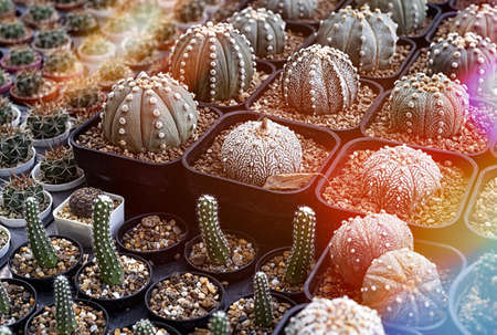 Cactus and succulent plants in many small pots on a farm under sunlight. Modern natural home miniature green corner decoration.