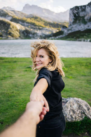 A beautiful caucasian blonde woman holds a man's hand in a mountainous landscape with lake