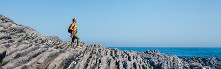 Young woman with backpack walking through flysch rock landscape