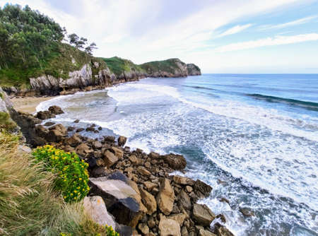 Atlantic ocean rocky coastline near Portio Beach, (Pielagos, Cantabria, Spain)