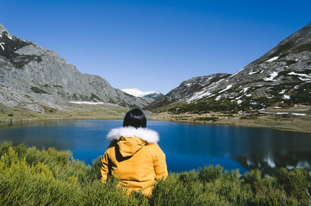A young tourist from behind visiting Lake Ercina in the Lakes of Covadonga. Asturias. Spain