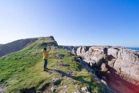 Young male tourist in yellow jacket at Urro del Manzano rock formation sea stack natural arch bridge in Liencres Arnia Costa Quebrada Biscay atlantic ocean Santander Cantabria, Spain Europe