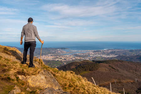 A young man in a gray sweater looking at the views of the towns of Hondarribia and Hendaya from the mountains of Aiako Harria or Peñas de Aya, Guipúzcoa. Basque Country