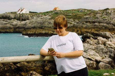 A woman enjoying a coastal view while looking at phone. A mature woman in sunglasses and white T-shirt using a smartphone while leaning on a wooden railing on a scenic seaside