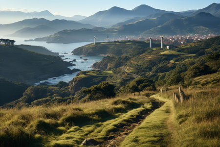 Embark on a journey through a serene landscape with majestic mountains, a tranquil sea, and a winding path. Let natures beauty inspire your sense of adventure and wonder.