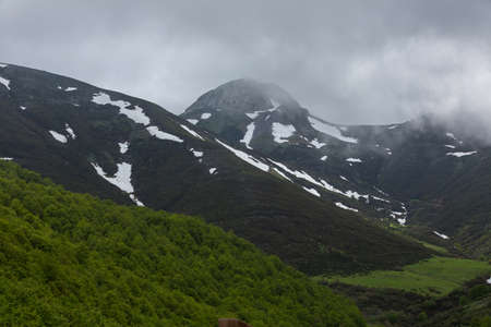 Mountain landscape in the Picos de Europa national park, Spain, Asturias. Snow on the mountain peaks.