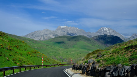 A breathtaking wide shot of a scenic mountain road, winding through the lush, green landscapes of Somiedo Natural Park