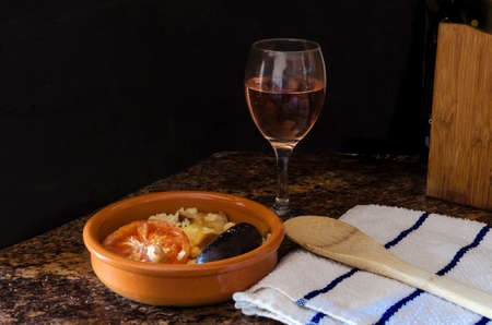 Baked Valencian rice accompanied by local wine